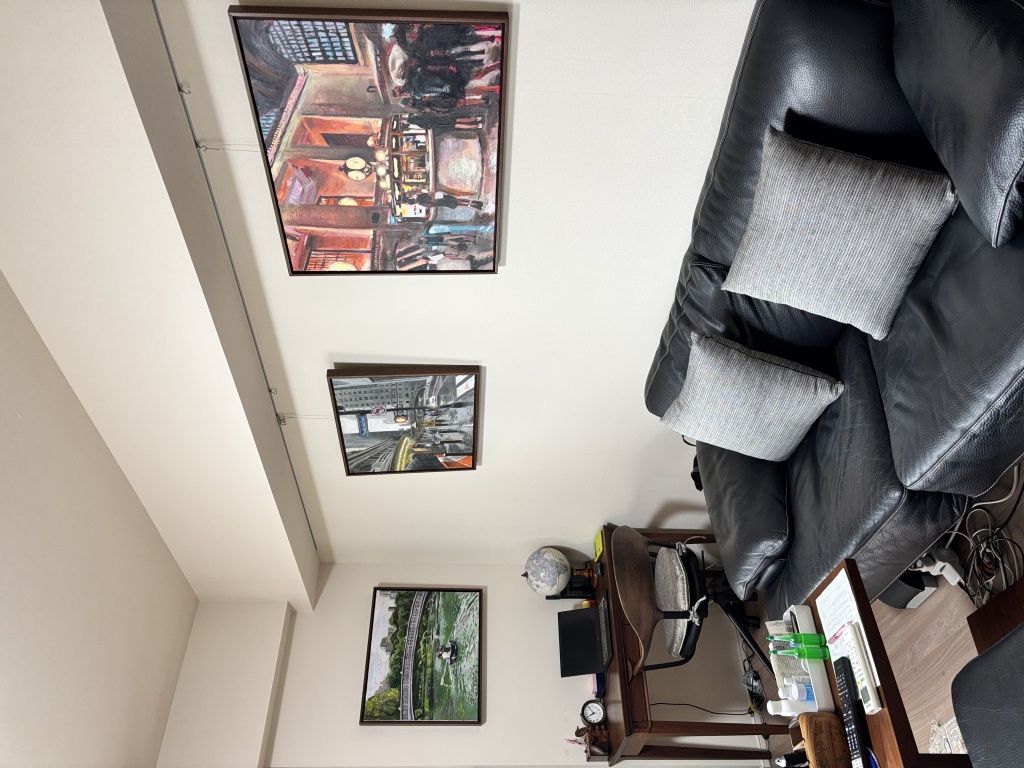 NYの三浦さんの絵が3点揃って色々掛けて観ましたがNYからスーさんの指令が飛び、結局この配置がいいと言われました。「NY生活誌」の三浦良一さんの絵が好きで、NYで亡くなった百合子もこの場所、景色が好きだったのでうちは神棚とか仏壇が無いので記念碑です。